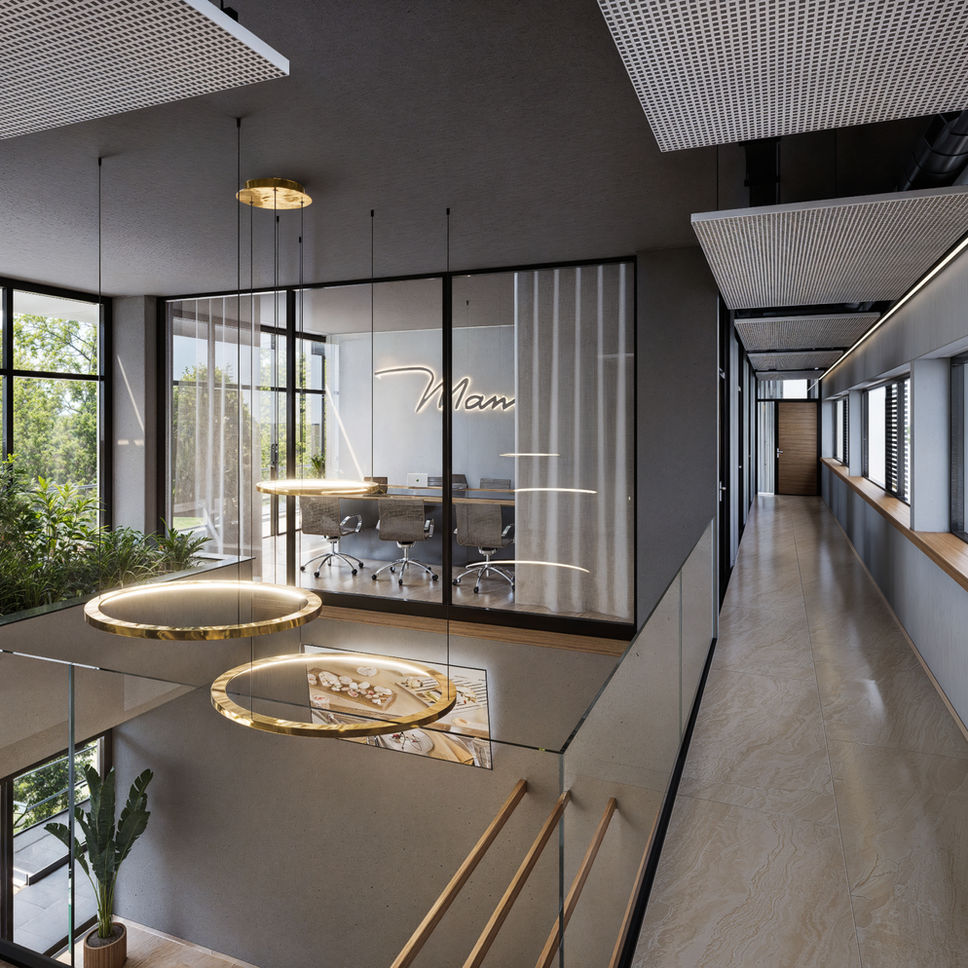 Der Eingangsbereich empfängt Besucher mit einer zweigeschossigen Galerie, die Offenheit und Transparenz ausstrahlt. Innen dominieren warme Materialien und eine harmonische Licht- und Akustikplanung, die das Wohlbefinden der Mitarbeiter in den Mittelpunkt stellt.